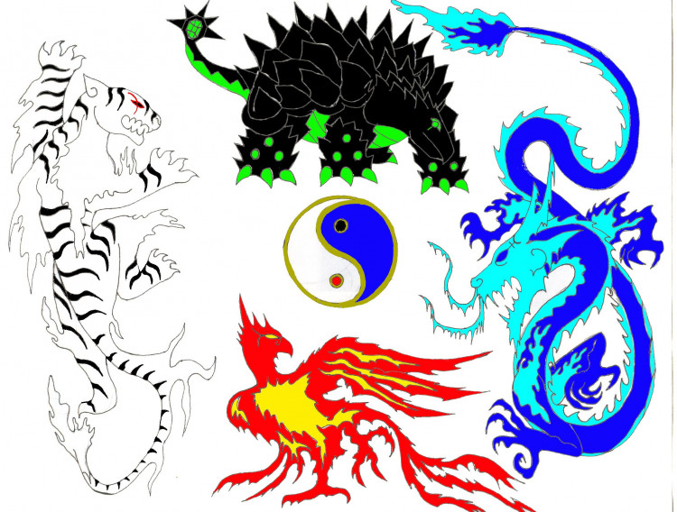 Çin mitolojisine göre; takımyıldızları içinde her biri dünya üzerinde bir yönü aynı zamanda bir mevsimi, bir rengi ve bir elementi temsil eden dört büyük hayvan sembolü vardır. Bu dört önemi sembolin Kozmik Yumurtadan çıkan Tanrı Pan-Gu evreni şekillendirirken oan yardımcı olduklarına inanılmaktadır.