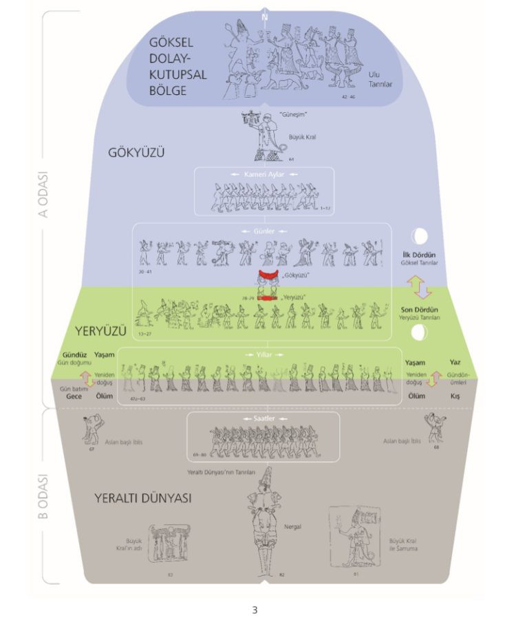 Yazılıkaya’daki Hitit tanrılarının rölyefleri katı bir hiyerarşik düzene bağlıdır ve büyük kral IV. Tudhaliya’nın bir tasviri ile karşı karşıyadırlar. Bununla birlikte, tanrı alayının ne anlama geldiği, tapınak neredeyse iki yüz yıl önce akademisyenlerce ilk kez görüldüğünden beri bir muamma olmuştur. 1994-2005 yılları arasında Hattuša’daki kazılara başkanlık eden prehistoryen Juergen Seeher, 2011’de Yazılıkaya hakkındaki son monografisinde şunları yazmıştı: “Kaya tapınağının gerçekte hangi işlevi yerine getirdiği bugün hâlâ açık değil.” Şimdi ilk kez, İsviçreli, ABD’li ve Türk tarihçi ve gökbilimcilerden oluşan bir ekip, tapınaktaki tüm figürleri kucaklayan ve figürlerin her birine makul bir işlev atayan bir açıklama sunuyor. Bilimsel makale bugün hakemli Journal of Skyscape Archaeology dergisinde yayınlandı ve ücretsiz olarak temin edilebilir. Bilim insanlarına göre, kutsal alan Hititlerin hayal ettiği şekliyle kozmik düzenin sembolik bir temsili olabilir. Sanatsal kabartmalar bir yandan kozmosun durağan kademelerini - yeraltı dünyası, yeryüzü, gökyüzü ve yukarıdaki ulu tanrılar - diğer yandan yenilenme ve yeniden doğuşun döngüsel süreçlerini temsil etmektedir: gündüz ve gece, ayın evreleri ve mevsimler. Doksandan fazla figürün her biri bu sisteme bağlıdır.