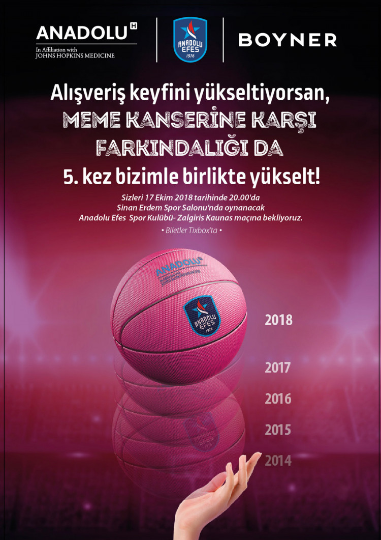 Anadolu Sağlık Merkezi ve Anadolu Efes Spor Kulübü iş birliğiyle geçtiğimiz yıllarda Beren Saat, Bergüzar Korel, Sinem Kobal ve Elçin Sangu’nun gönüllü destekleriyle gerçekleştirilen proje bu yıl da ünlü bir ismin desteğiyle hayat bulacak. 17 Ekim’de Anadolu Efes ve Zalgiris Kaunas arasında oynanacak Turkish Airlines EuroLeague karşılaşmasının hava atışı yine Pembe Top ile yapılacak. Proje, bu yıl perakende sektörünün lider markalarından Boyner’in de katkılarıyla daha fazla kadına ulaşacak.