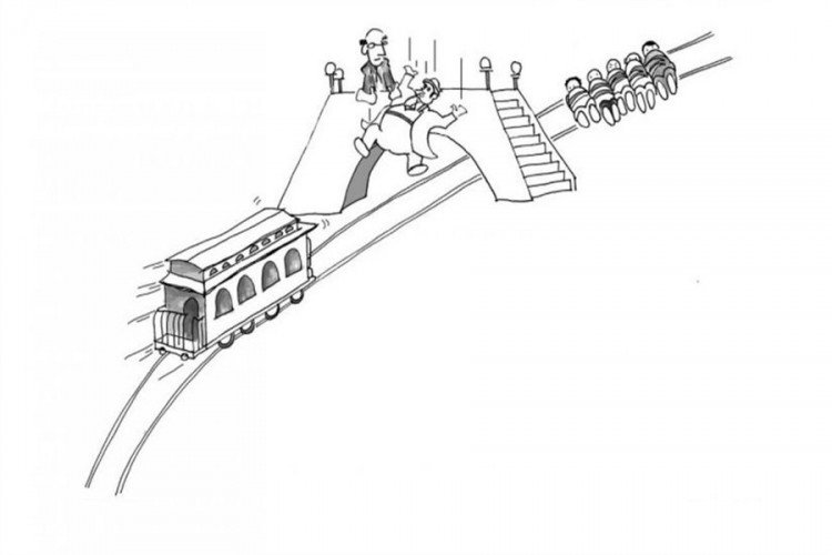 Tramvay İkilemi sorusu: Yaklaşan bir tren var ve siz yanınızdaki kolu çekerek makas değiştirerek, raylar sayesimde trenin yönünü değiştirme şansına sahipsiniz. Trenin güzergahında 5 işçi çalışıyor. Eğer trenin yönünü değiştirmezseniz beş kişi ezilecek. Ancak makas yaparsanız trenin yeni yönündeki rayların üzerinde de bir işçi çalışıyor. Rayların yönünü değiştirirseniz bir kişiyi, değiştirmezseniz 5 kişiyi öldürmüş olacaksınız!