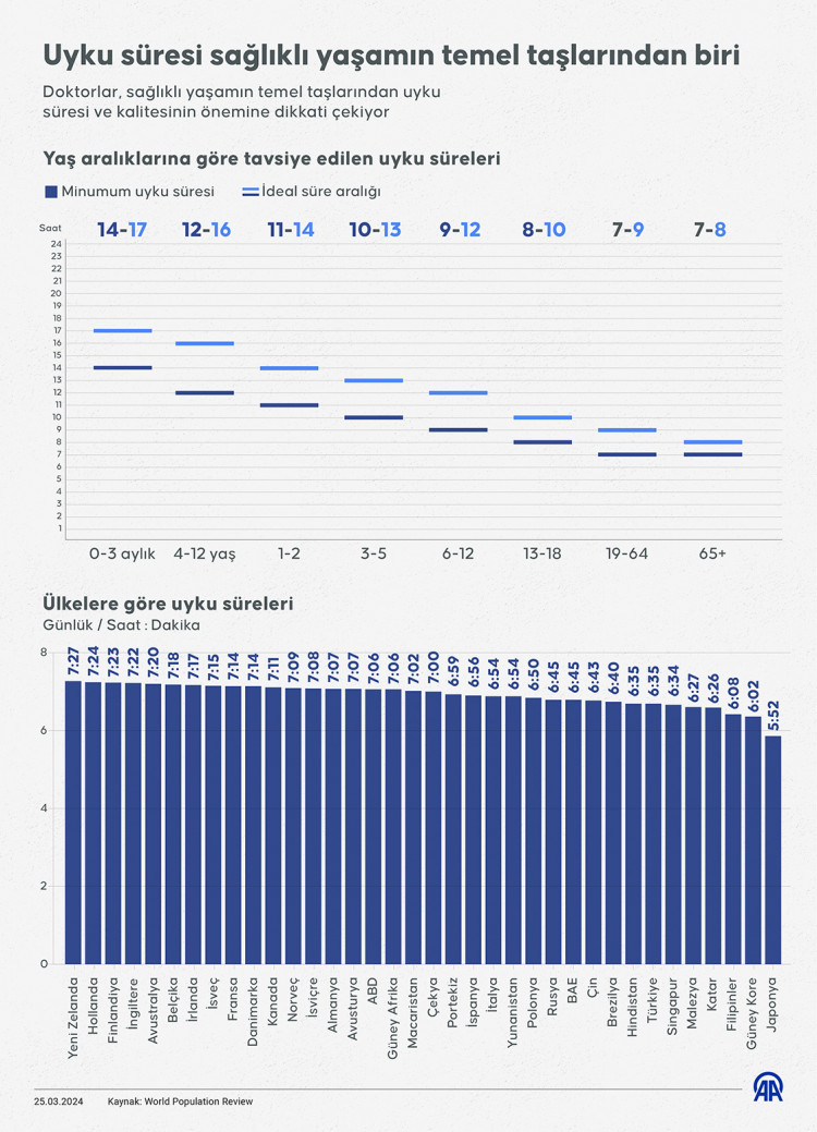 Tavsiye edilen günlük uyku süreleri, 6-12 yaş için 9-12 saat, 13-18 yaş için 8-10 saat, 18 yaş üzeri yetişkinler için de her gece en az 7 saat olarak belirleniyor.