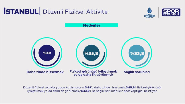 Fiziksel aktivite yapan İstanbulluların yüzde 59’u “daha zinde hissetmek”, yüzde 35,8’i “fiziksel görünüşünü iyileştirmek”, yüzde 33,8’i ise “sağlık sorunlarını azaltmak” için egzersiz yaptığını belirtti. Kadınların yüzde 34,9’u kilo vermek, erkeklerin yüzde 28,1’i stres atmak ve eğlenmek için spor yapıyor.