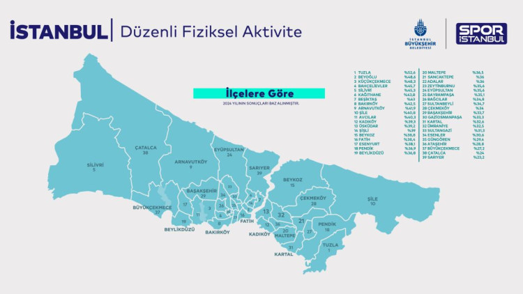 | 2020 hareketlilik oranı: %13,2 2023 oranı: %34,9 2024 oranı: %37,1 Kadınlarda aktivite oranı: %35,3 Erkeklerde aktivite oranı: %39,3 Haftada 150 dakika egzersiz yapanların oranı: %66 (2023’te %38,7) En aktif ilçe: Tuzla (%52,6) En durağan yaş grubu: 65 yaş üstü |