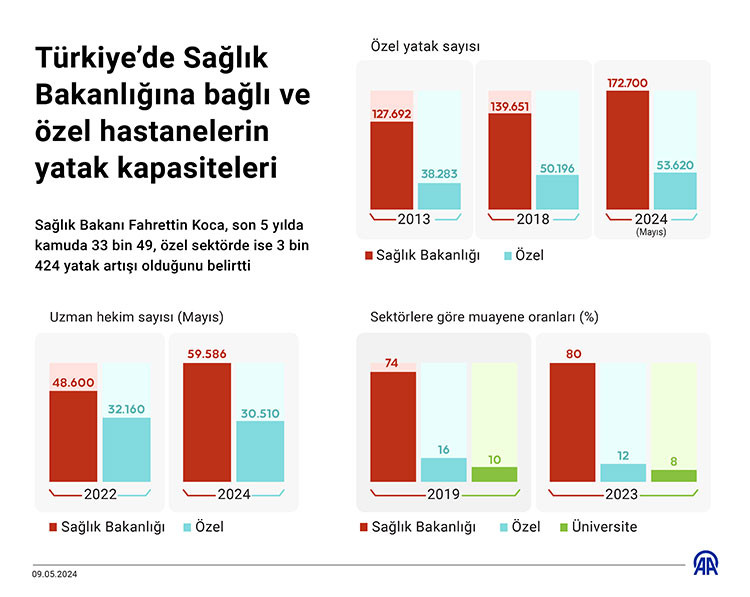 Son 5 yılda kamuda 33 bin 49, özel sektörde ise 3 bin 424 yatak artışı olduğunu dile getiren Koca, bu dönemde özel hastanelerdeki yatak artışının kamunun 10'da 1'i düzeyinde olduğuna dikkati çekti.