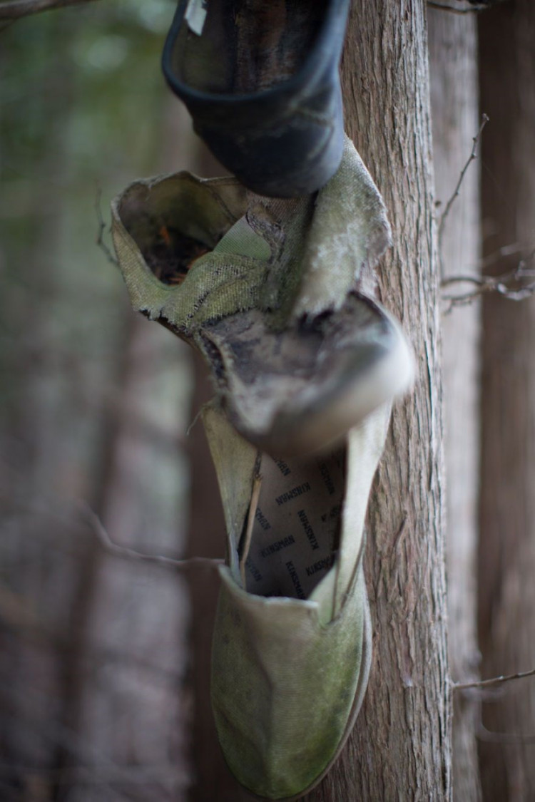 Çeşitli model ve ebatlardaki yüzlerce ayakkabanın ağaç dallarından sarkıtıldığını gören Maher, sıradışı ormanı fotoğrafladı.