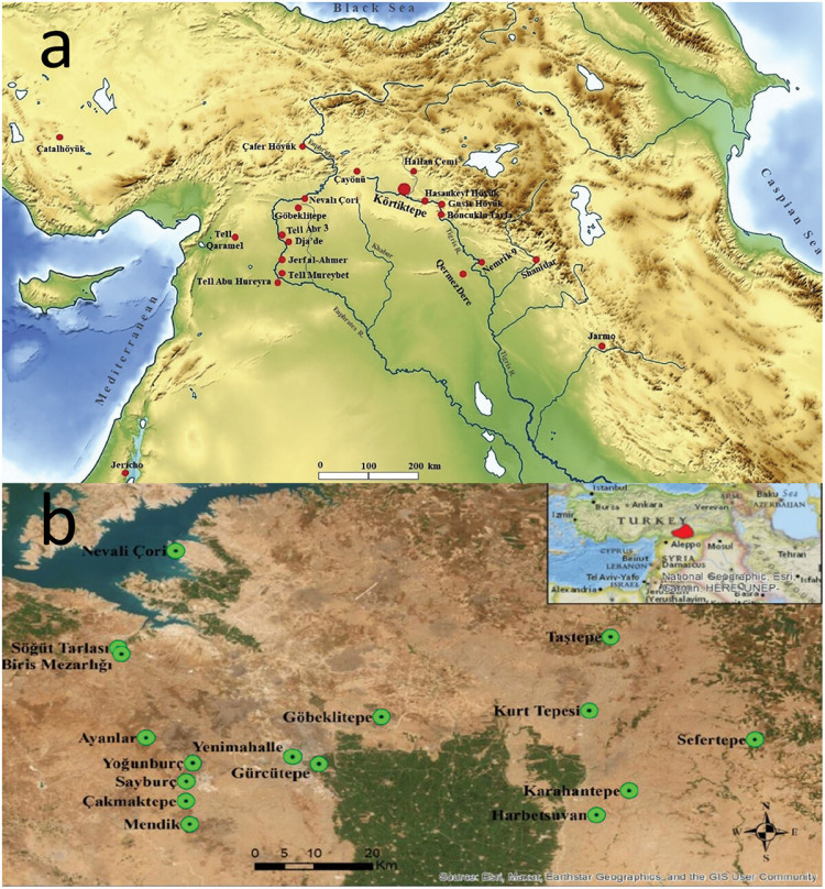 (a) Yukarı Mezopotamya'da Göbekli Tepe çevresindeki arkeolojik alanlar (Siddiq ve ark. Citation 2021). (b) Göbekli Tepe ve Harran ovası çevresindeki alanlar (Taş Tepeler) (Ayaz Citation 2023).