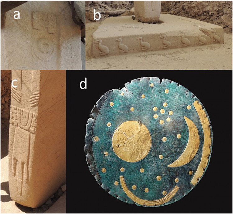 (a) Sütun 18'in 'başı'nın altındaki 'H-sembolünün' altında muhtemel ay ve güneş sembolleri. (b) Sütun 18'in tabanında muhtemelen Ülker takımyıldızını simgeleyen yedi kuş. (c) Sütun 18'in dar, iç yüzünde, her ikisi de bir kuyruklu yıldızı andıran kemer tokası ve tilki postu peştamal. (d) Güneş, ay, Ülker ve muhtemelen bir kuyruklu yıldız sembollerini gösteren Nebra gök diski (resim Wikipedia'dan, CC-by-4.0). Resim a, b ve c, Alistair Coombs'un izniyle kullanılmıştır.