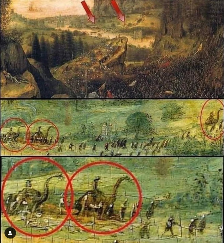 Ve şimdi buna benzer yeni ve eğlenceli bir durumla karşı karşıyayız. “Peter·Bruce Gale”in 1562 yılında yaptığı bir tablo nedeniyle bazı insanlar, dinozorların 500 yıl önce insanlarla birlikte yaşadığına inanıyor. Böyle bir gönderide Instagram kullanıcısı historyunreal “Bu Peter Bruce Gale’in 1562’de yaptığı bir tablo... Sözde dinozorlar hakkında herhangi bir şey öğrenmemizden 300 yıl önce” diyor.