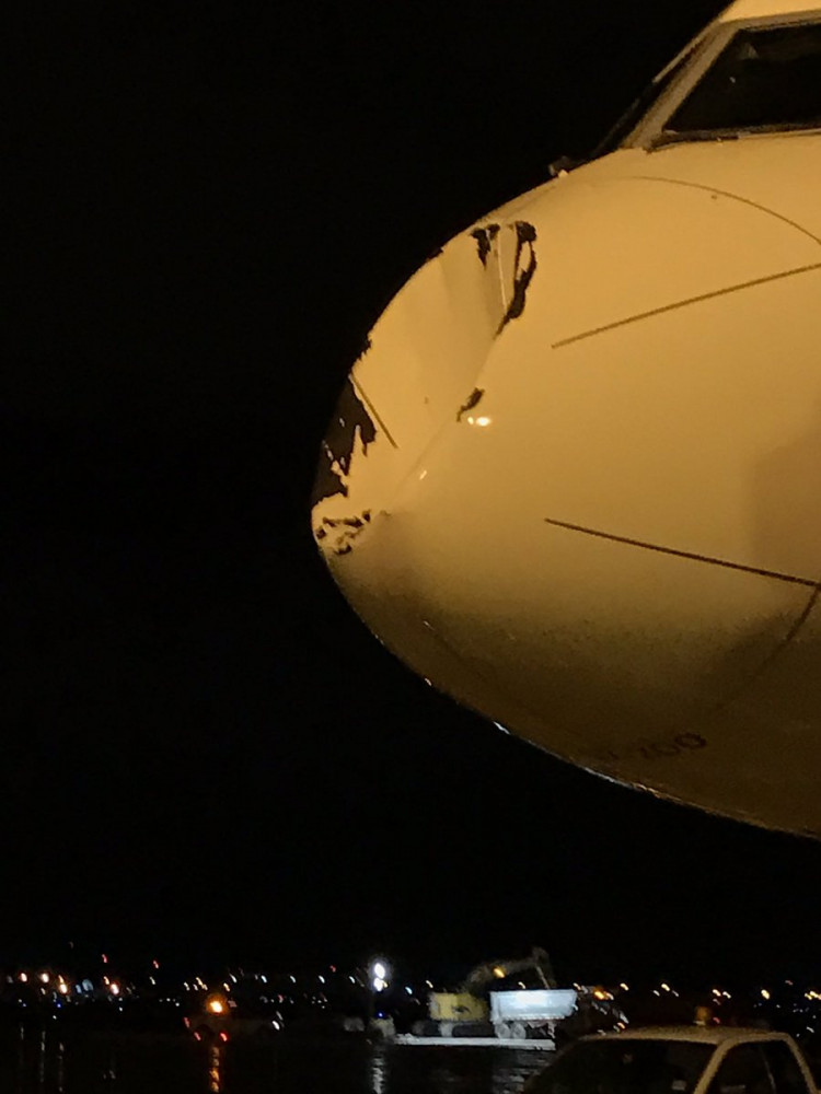 Yaşanan ilginç olaya rağmen yolcuğunu tamamlayabilen uçağın, burun kısmının çarpışmadan dolayı ezildiği gözlemlendi.