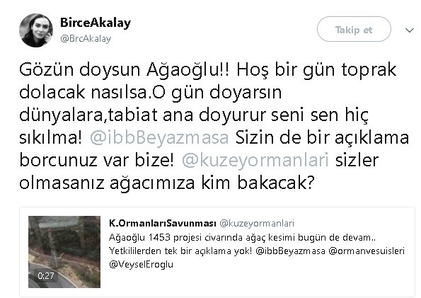 “Gözün doysun Ağaoğlu!! Hoş bir gün toprak dolacak nasılsa.O gün doyarsın dünyalara, tabiat ana doyurur seni sen hiç sıkılma! @ibbBeyazmasa Sizin de bir açıklama borcunuz var bize! @kuzeyormanlari sizler olmasanız ağacımıza kim bakacak?”