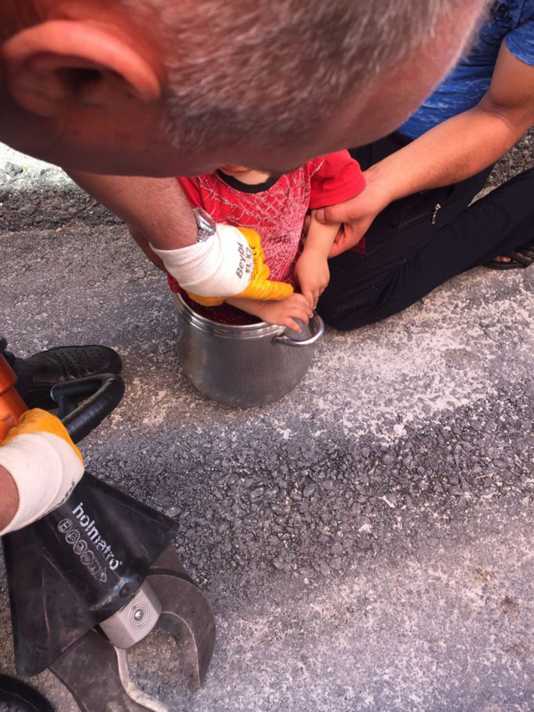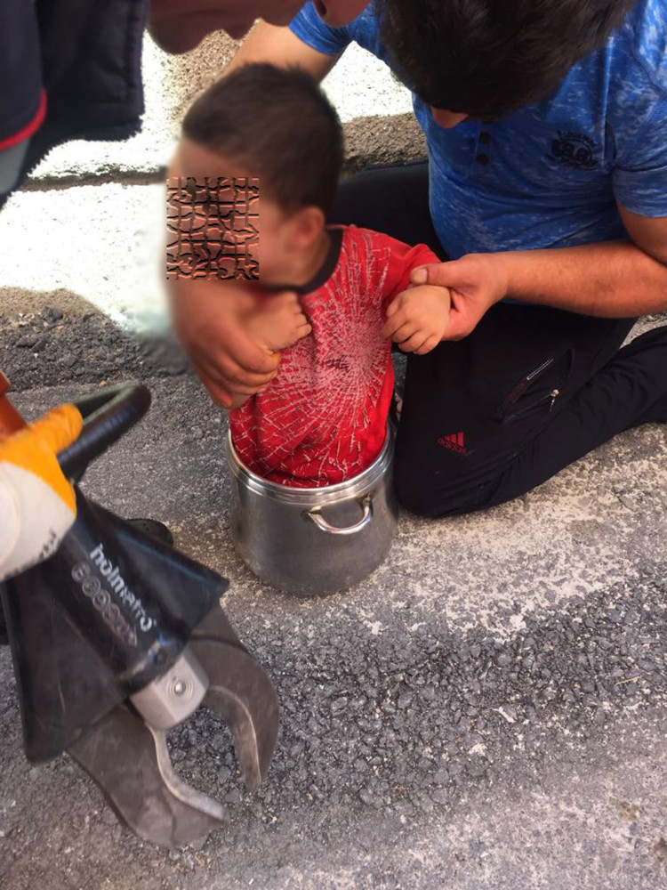 Tencerenin içine oturan küçük çocuk, ayak ve diz kapaklarının sıkışması sonucu çıkamadı.