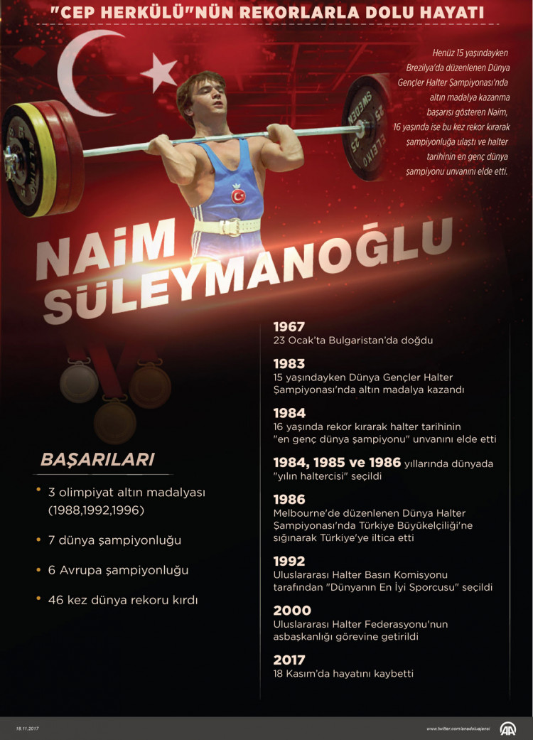Olimpiyat ve dünya şampiyonu eski milli halterci Naim Süleymanoğlu, tedavi gördüğü hastanede 50 yaşında yaşamını yitirdi.