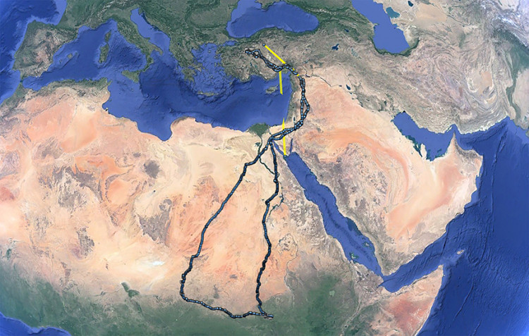 Midas, 17 Eylül 2022'de Hatay'da İskenderun, sonra da sırasıyla Suriye, Ürdün, İsrail ve Mısır'dan geçti. Mısır yolculuğu esnasında Süveyş kanalından geçerek 5 günde Libya'ya, oradan da Çad'a ulaştı.