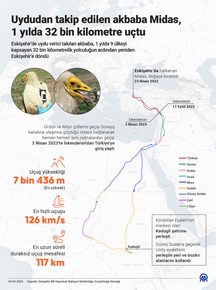 23 Nisan 2022'de doğaya bırakılan, "Midas" adı verilen akbaba, yaklaşık 5 ay boyunca Eskişehir civarında vakit geçirip havanın soğumasıyla eylülde güneye doğru göçe başladı.