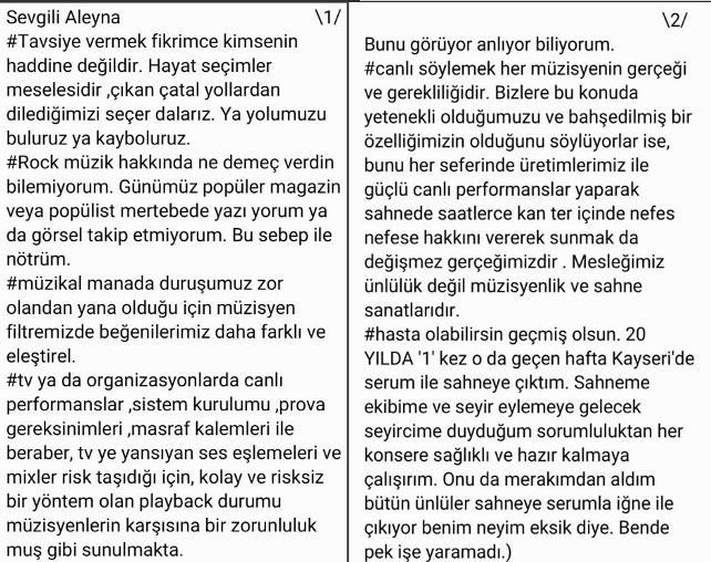 Aleyna Tilki ise bugün akşam saatlerinde Hayko Cepkin'e cevaben tweet attı. Kendisinin hasta bir şekilde sahneye çıktığını belirten Tilki, Cepkin'in eleştirisini ti'ye alarak yanıt verdi.