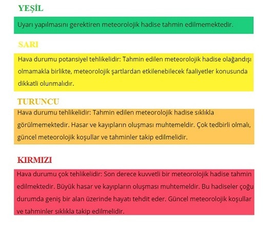 Kadıoğlu, sistemin Avrupa'daki 34 ülkenin kullandığı MeteoAlarm altyapısına dayandığına dikkati çekerek, meteorolojik hadiselerin şiddeti, süresi, etki alanı ve görülme sıklığına göre renklerle sınıflandırıldığını aktardı. Kadıoğlu, "Bu sistem, vatandaşın tehlikeyi hızlı ve sade bir şekilde anlaması için geliştirildi. Ancak renklerin ne anlama geldiği ve buna karşılık hangi davranışın sergilenmesi gerektiği yeterince bilinmiyor." ifadesini kullandı.