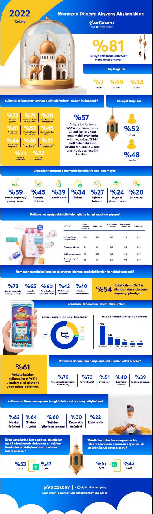 . Katılımcıların %60’ı Ramazan ayı için alışveriş yaparken akıllı telefonlarını kullanacaklarını belirtirken, %71'i uygulama içinden alışveriş yapacağını belirtiyor. Ankete katılanların %52'si, akıllı telefonlarında karşılaştıkları reklamların satın alma kararlarında büyük etkisi olduğunu belirtiyor. Bu oran ise TV’de %22 olarak karşımıza çıkıyor. Bambaşka sektörlerden farklı reklamlarla karşılaşırken; Ramazan ayında Türkiye’deki kullanıcıların %79’u gıda reklamlarıyla karşılaşmak isterken, bunun %73 ile giyim ve %51 ile ev ürünleri reklamları takip ediyor.