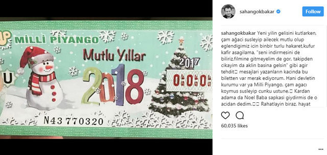"Yeni yılın gelişini kutlarken, çam ağacı süsleyip ailece mutlu olup eğlendiğimiz için binbir türlü hakaret, küfür, kafir, aşağılama 'Seni indirmesini biliriz', 'Filmine gitmeyelim de gör', 'Takipten çıkarayım da aklın başına gelsin' gibi ağır tehdit mesajları yazanların kaçında bu biletten var merak ediyorum.