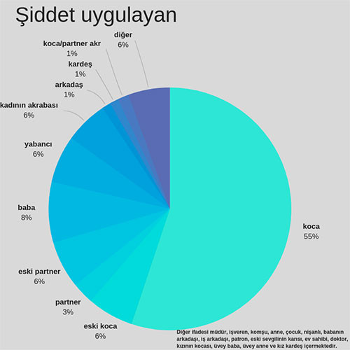 800 başvurunun 682’sinde şiddet uygulayan kaydedildi. Şiddet uygulayanların %91’i yine kadınların yakını olan, tanıdıkları erkeklerdi. Kadınların %61’i kocalarının ya da eski kocalarının şiddetine maruz kaldıklarını paylaştılar.