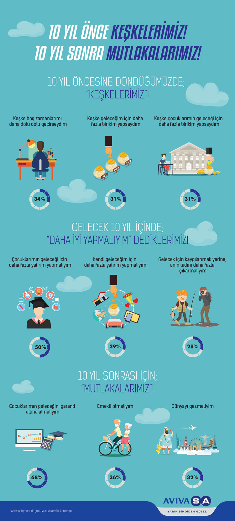 Araştırmayla ilgili bir açıklama yapan AvivaSA CEO’su Fırat Kuruca, araştırmanın, 10. yıl kutlamaları kapsamında gerçekleştirdikleri projelerden birisi olduğunu vurgulayarak; “Ağustos ayında, Türkiye’nin dijitalleşme, müzik, sinema ve spor alanlarında son 10 yılını incelediğimiz, değerli isimlerin röportajlarıyla zenginleşen video çalışmalarından oluşan bir dijital iletişim çalışması başlatmıştık. Televizyonda ve tüm sosyal medya hesaplarımızda yayımlanan ve yoğun ilgi gören bu projemiz paralelinde, bir de araştırma çalışması yapmaya karar verdik. Araştırmamızda, son 10 yıl için Türk insanının ‘Ah keşke!’ dediği konuları, gelecek 10 yıl için arzu ve isteklerini ve belirlediğimiz 4 alanın akılda kalan sanatçı ve sporcuları ile önemli başarılarını belirlemeyi hedefledik ve oldukça ilginç sonuçlar aldık.” dedi.
