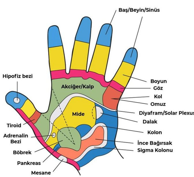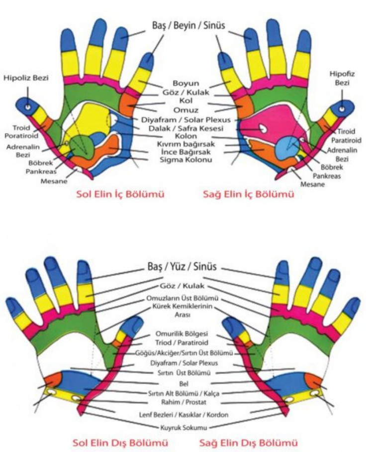 Tüm duygusal ve enerji noktalarının elden başladığına inanılır. Hafif uyumlu dokunmalar sayesinde eldeki enerjinin harekete geçirilmesi sıkıntıları gidermede yararlı olur.