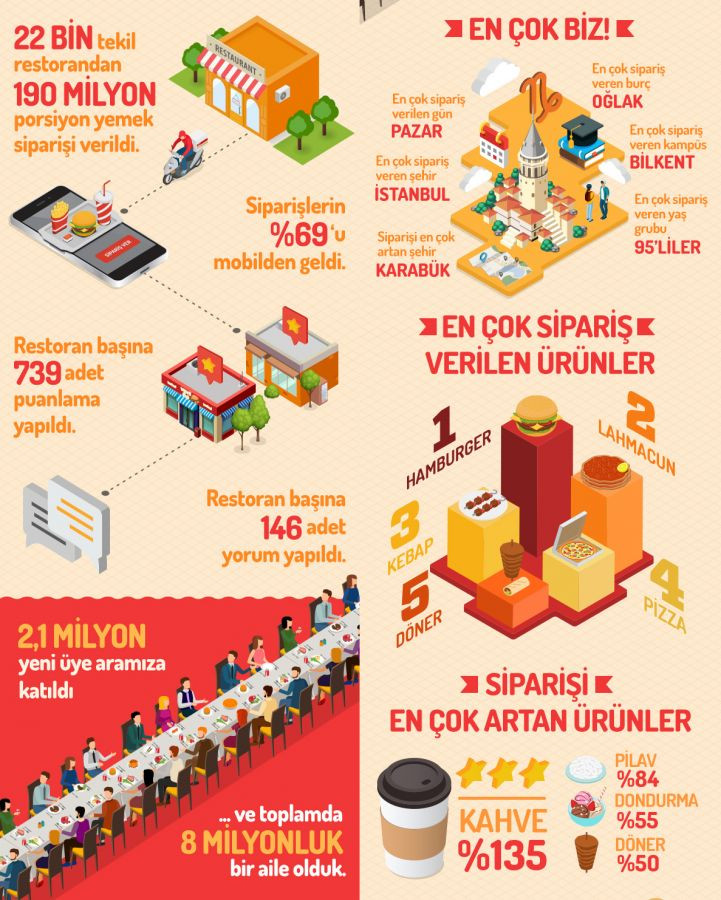 Yemeksepeti bu yıl da yine Türkiye’nin yemek tercihlerinin nabzını tutuyor. 2017’de 2,1 milyon yeni üyenin katılımıyla 8 milyon kişilik dev bir aileye dönüşen Yemeksepeti’nde, 22 bin tekil restorandan 190 milyon porsiyon yemek siparişi verildi.