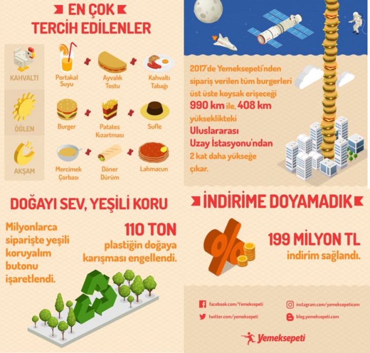 Yemeksepeti bu verileri inceleyerek, Türkiye’nin 2017’deki bir günlük menüsünü çıkardı. Buna göre sabahları kahvaltıda kahvaltı tabağı ve portakal suyu tercih edildi. Kahvaltılar Ayvalık tostuyla pekiştirildi. Güne sıkı bir başlangıcın ardından, öğle menüsünde burger, patates kızartması ve çikolatalı sufle üçlüsü yendi. Global lezzetlere göz kırpan bu menüyü akşamları Türk mutfağı takip etti. Akşam yemeğinin vazgeçilmezi mercimek çorbası, döner dürüm ve lahmacun oldu.