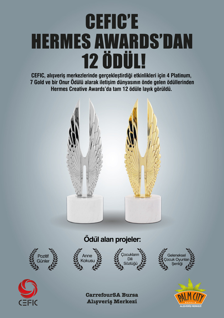 CEFICyönetimindekiAlışveriş Merkezleri, Pazarlama ve İletişim Profesyonelleri Derneği tarafından dünyadaki en seçkin ve yaratıcı projeleri seçmek ve yaratıcılığı teşvik etmek amacıyla 1995 yılından beri Amerika düzenlenen Hermes Creative Awards 2018'den 12 ödüle layık görldü. Platinum, Gold ve Onur Ödülü olmak üzere 3 ayrı ödül tipi bulunan Hermes Creative Awards’a her yıl farklı ülkelerden binlerce proje başvuruda bulunuyor.