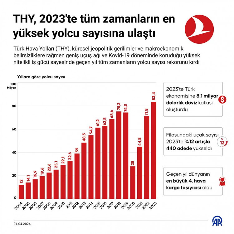 Türk Hava Yolları (THY), küresel jeopolitik gerilimler ve makroekonomik belirsizliklere rağmen geniş uçuş ağı ve Kovid-19 döneminde koruduğu yüksek nitelikli iş gücü sayesinde geçen yıl tüm zamanların rekoru olan 83,4 milyon yolcu taşıdı.